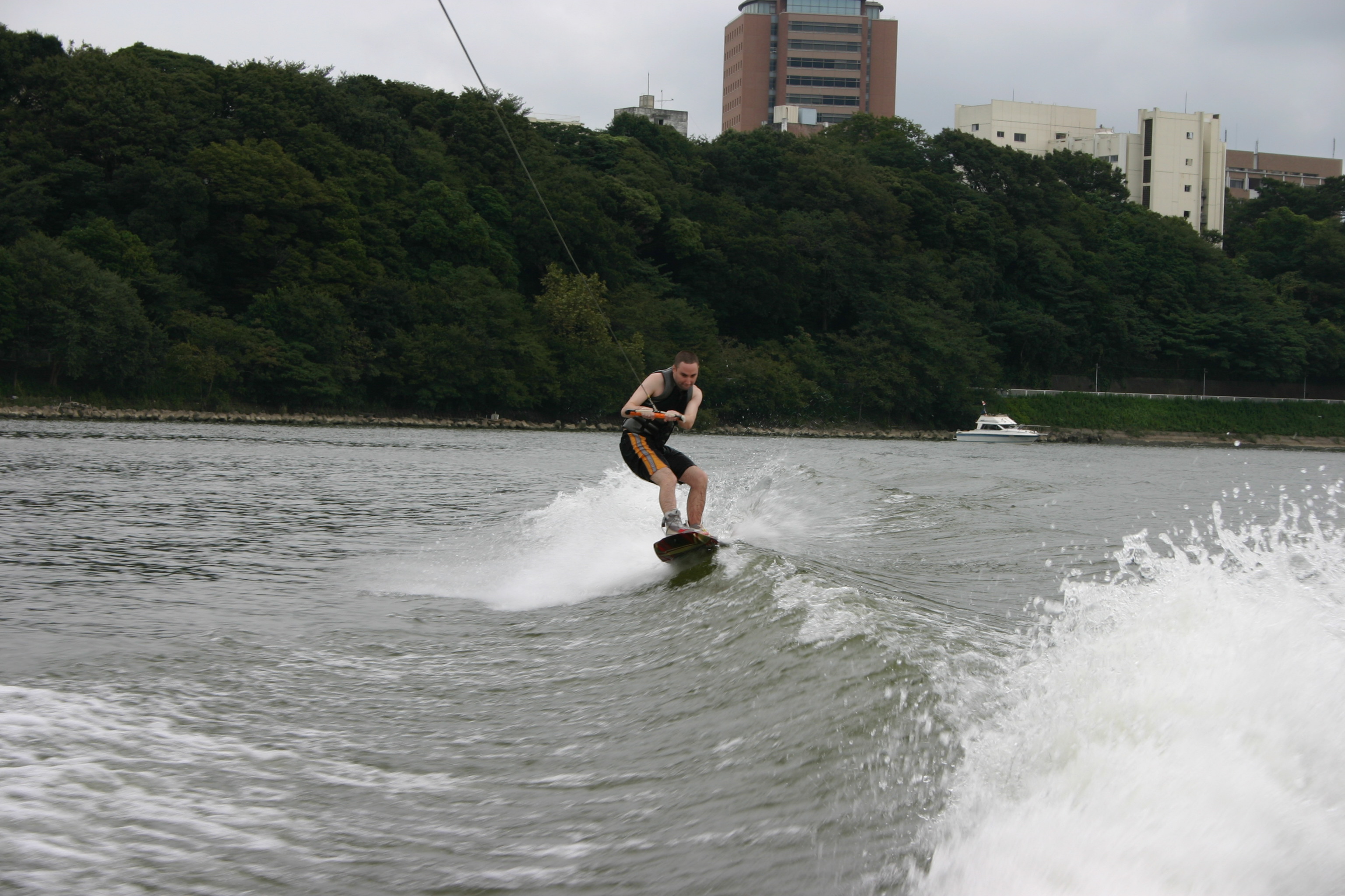 Move over Jack Osbourne because there’s a new adrenalin junkie in town and its me!! A couple of weeks ago it was bungy jumping and on September 23rd it was wake-boarding on the Edo River near Ichikawa on the Tokyo-Chiba border. For the uninitiated wake-boarding is like a cross between water-skiing and surfing.