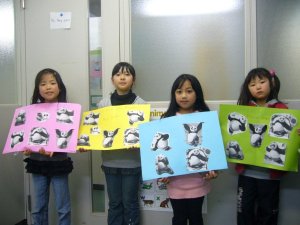 I never do craft work in kids lessons as I have always been of the opinion that in regular lessons it is bit of a cop-out when they are there to learn, practice and produce English via a wide variety of activities and games. However, I guess there’s a time and place for craft work and as a couple of my groups were ahead of pacing I decided to allow them to make a panda poster one week (using the target language of the recent units) and then a mask the following one which was worn while playing the ‘fishing for animals’ magnet game (see pictures to get the idea!)