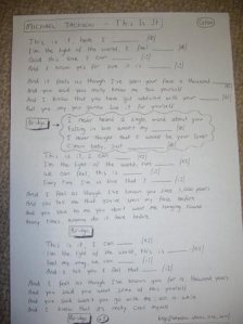For Halloween I used ‘Thriller‘ in my lessons with the adults which went down well and sensing the opportunity I decided to capitalise on the Japanese love for MJ by doing the new song ‘This is it‘ in a few lessons, particularly with those students who mentioned that they had seen the film. The song is much slower and easier to understand than ‘Thriller‘ and the words which I erased for the students to fill in all rhymed and/or had the same phonemic sounds which is something I learned on my TESOL course in the first half of this year.