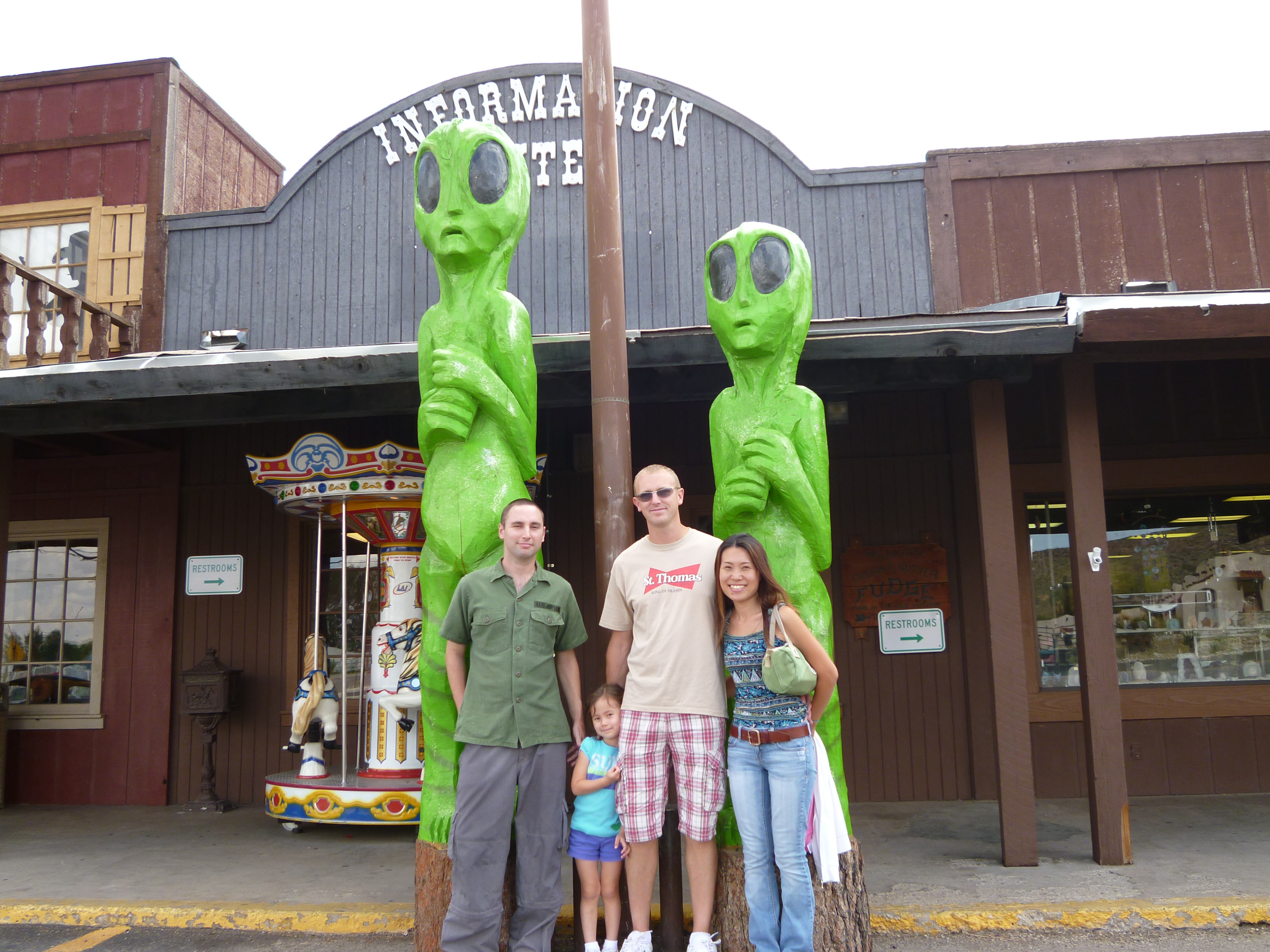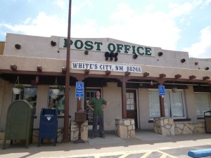 Far more impressive was the mountain which we saw both on the way there and on the return journey (below) before the heavens opened up and the road became flooded in no-time which caused one accident on the other side of the road. On the return journey we stopped for late lunch at a delightful area aptly named White City which played up to my stereotypical image of New Mexico in its appearance. Not quite sure why all the aliens were there. Maybe something to do with Roswell.