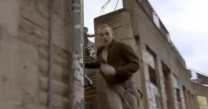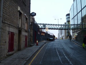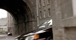 He runs on to Leith street where a car pulls out of St. Ninian’s Row and nearly hits him.