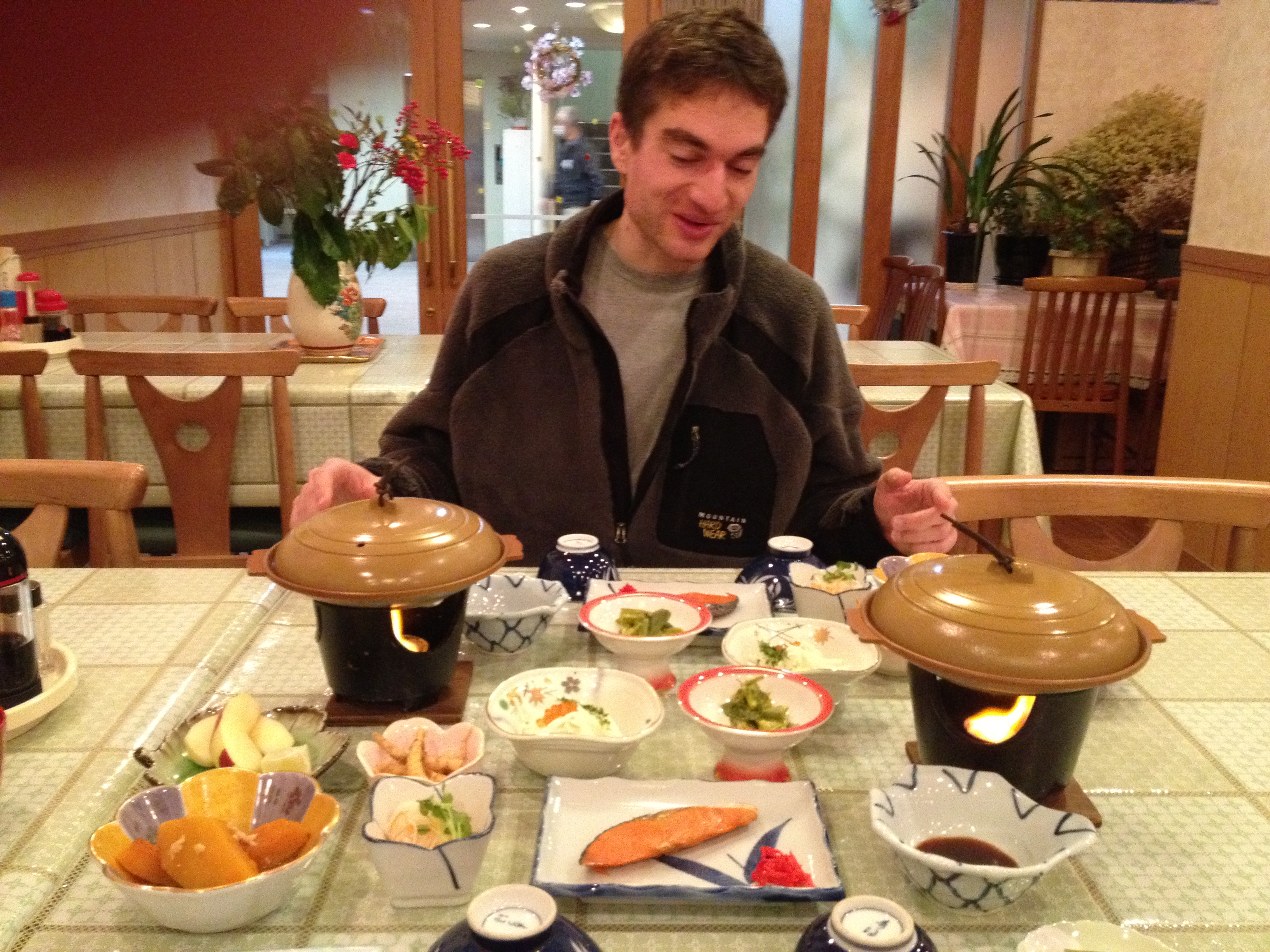 Back at our hotel we had an onsen (hot spring bath) followed by dinner where we realised we were the only guests! Dinner didn’t pass without incident as I dropped a spoonful of rice in my green tea whilst Asif set light to his chopstick trying to put out the cooker fire and no I have no idea what he was trying to do either!