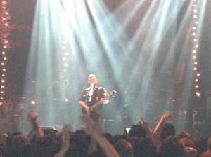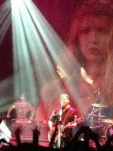 More importantly, the Manics took to the stage just after 7.45 pm starting off with ‘You Love Us’ which is a song I like but have never really loved…..until tonight when I could feel the hairs on the back of my neck standing on end as lead singer James Dean Bradfield belted out its powerful chorus. I was well happy with the first few songs before realising that they would probably all be good and I maybe wouldn’t miss the songs they didn’t play until after the concert. Even JDB needed lyrics for some of the songs such as PCP (a double A-side of ‘Faster’) and when Nicky mentioned the idea of playing a song that was a bonus track on the Japanese version of National Treasures he had no idea what the song went like!