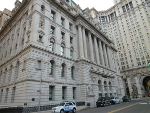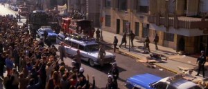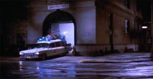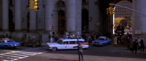 The Ghostbusters vehicle gets a police escort on 78 minutes along Centre Street and Chambers Street (below) as the four-some have a “date with a ghost” at Barrett’s haunted apartment.