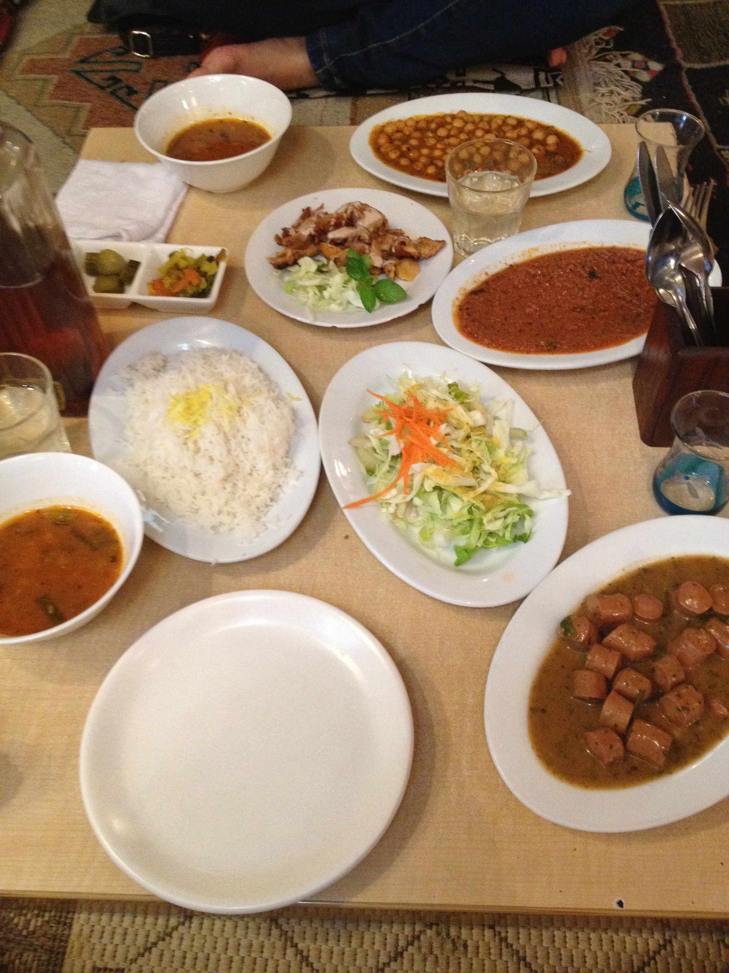 Sitting on Persian rugs which cover the floor your table is also at ground level and fairly quickly fills up as the staff bring you dish after dish as well as a Turkish fez hat!