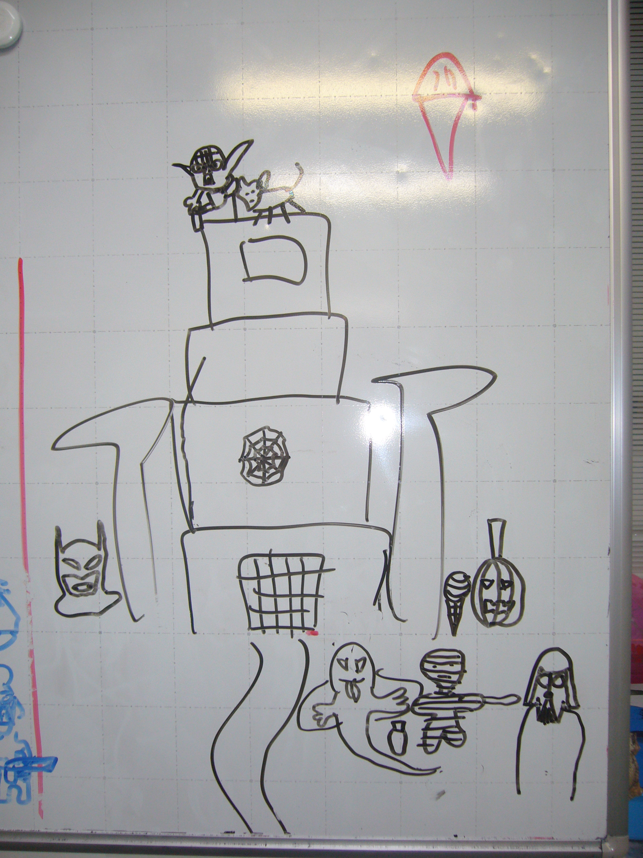 4. Preposition Drawing – This can be done on the whiteboard or in the students’ notebooks (if you want the evidence to remain!) and first you get them to draw some kind of Haunted house though any kind of regular house should suffice! Then you shout out instructions like ‘the witch is by/next to the house’ or ‘the ghost is under the house’ and let the students conjure up their own Halloween creations.
