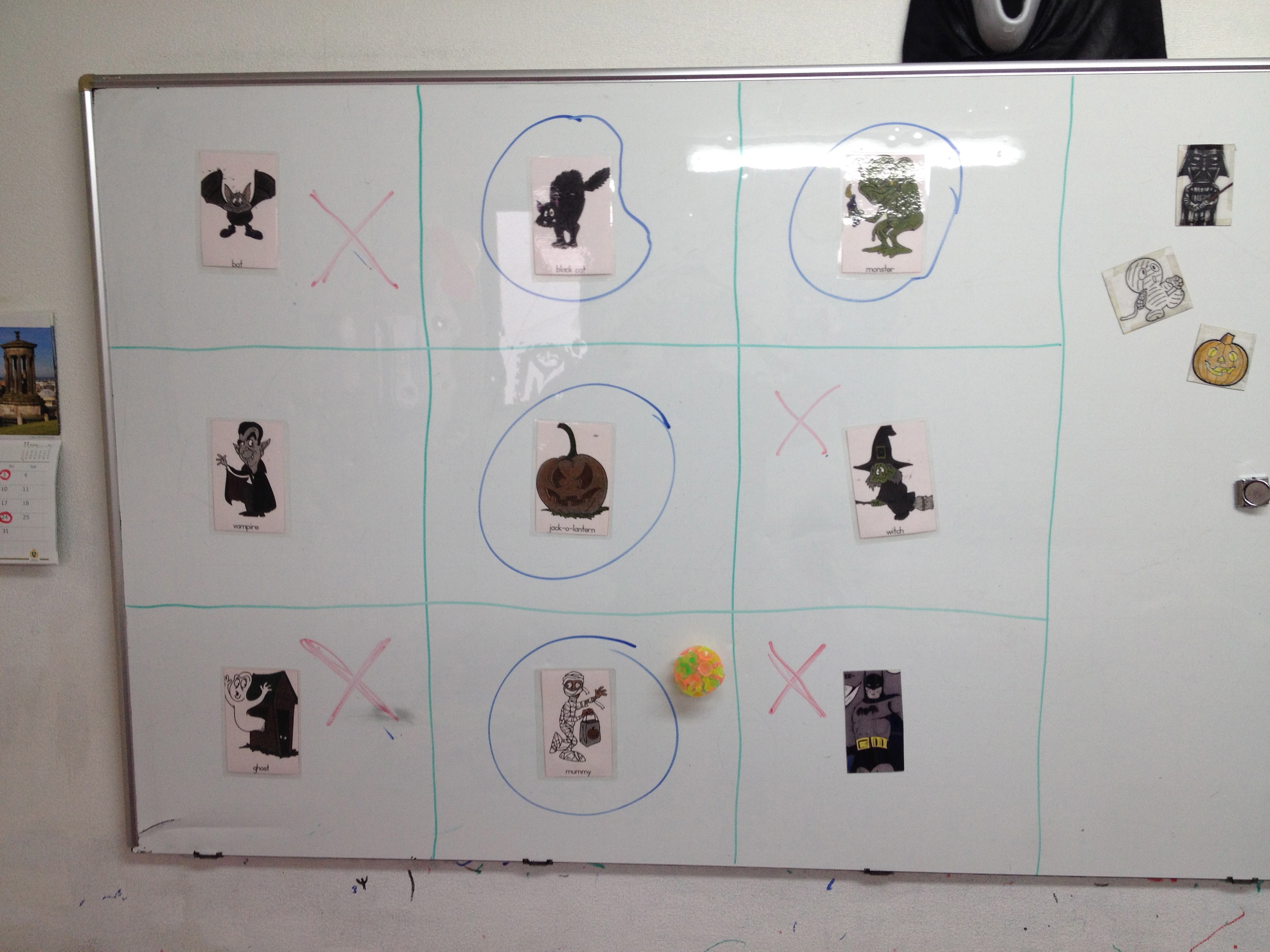 3. Halloween Naughts & Crosses – Use the whiteboard and divide it into 9 squares with one lexical item (i.e. Spider, Witch….) either written or drawn in each square. The students then throw a sticky ball at each square with the winner being the one who manages to get three-in-a-row.