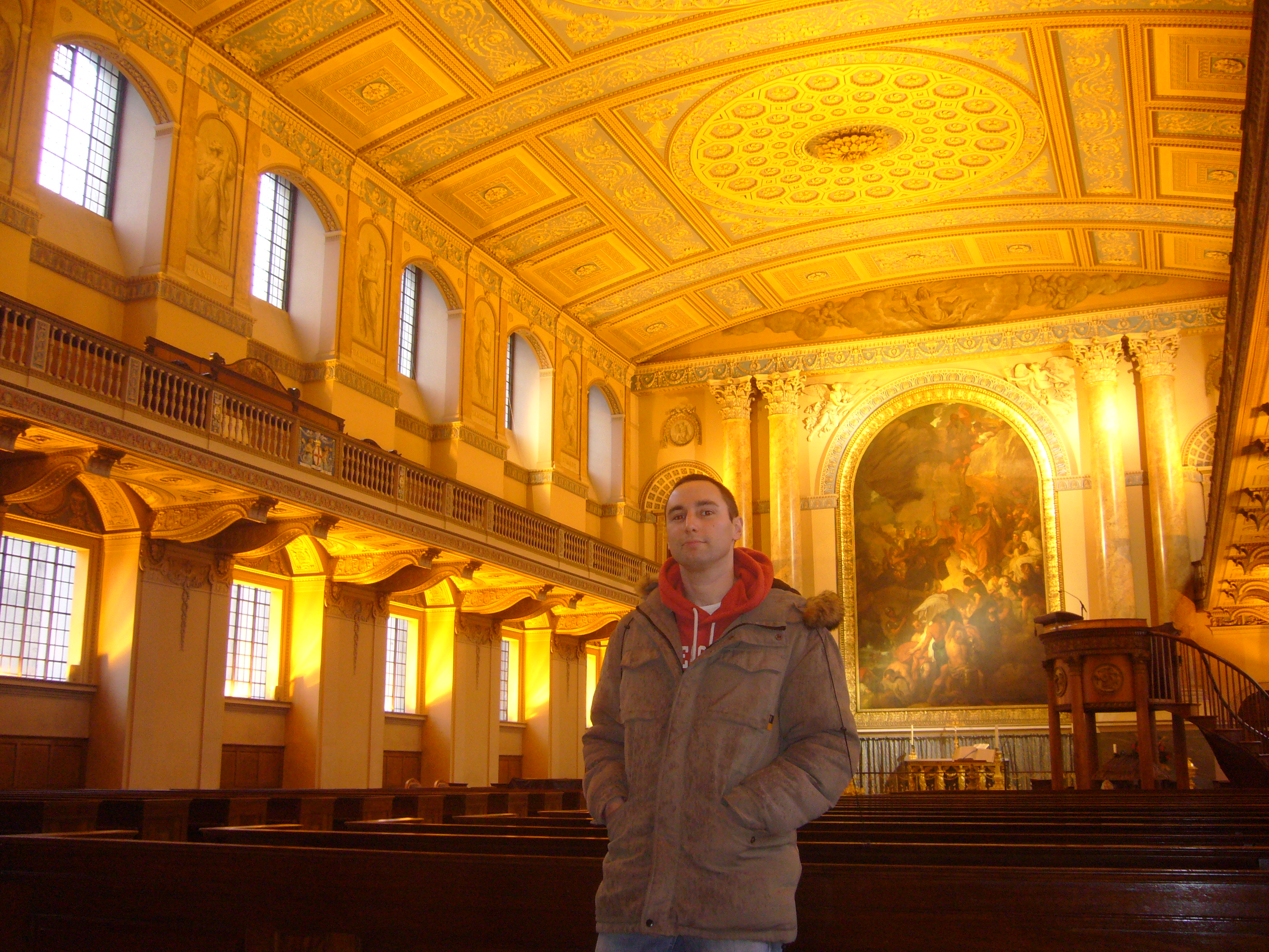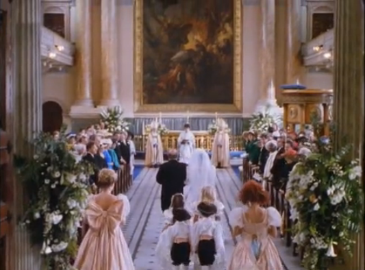 Rowan Atkinson is the master of ceremonies for the second wedding, between Bernard and Lydia, which takes place around the 34 minute mark with ‘St Mary of the Fields in Cripplegate’ actually being the Royal Naval College Chapel. Greenwich is the nearest rail station and the chapel (below) is open to the public and free. It also featured as the interior of a ‘Venice’ church in ‘Lara Croft Tomb Raider‘ (2001) and a fair few other films which are arguably of greater note!