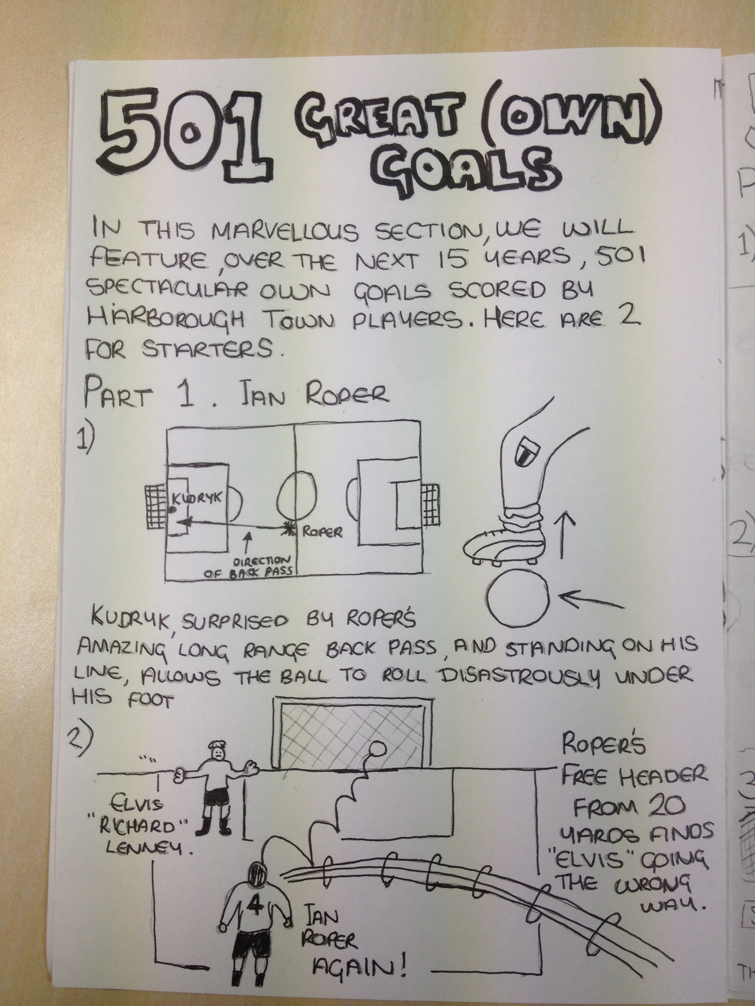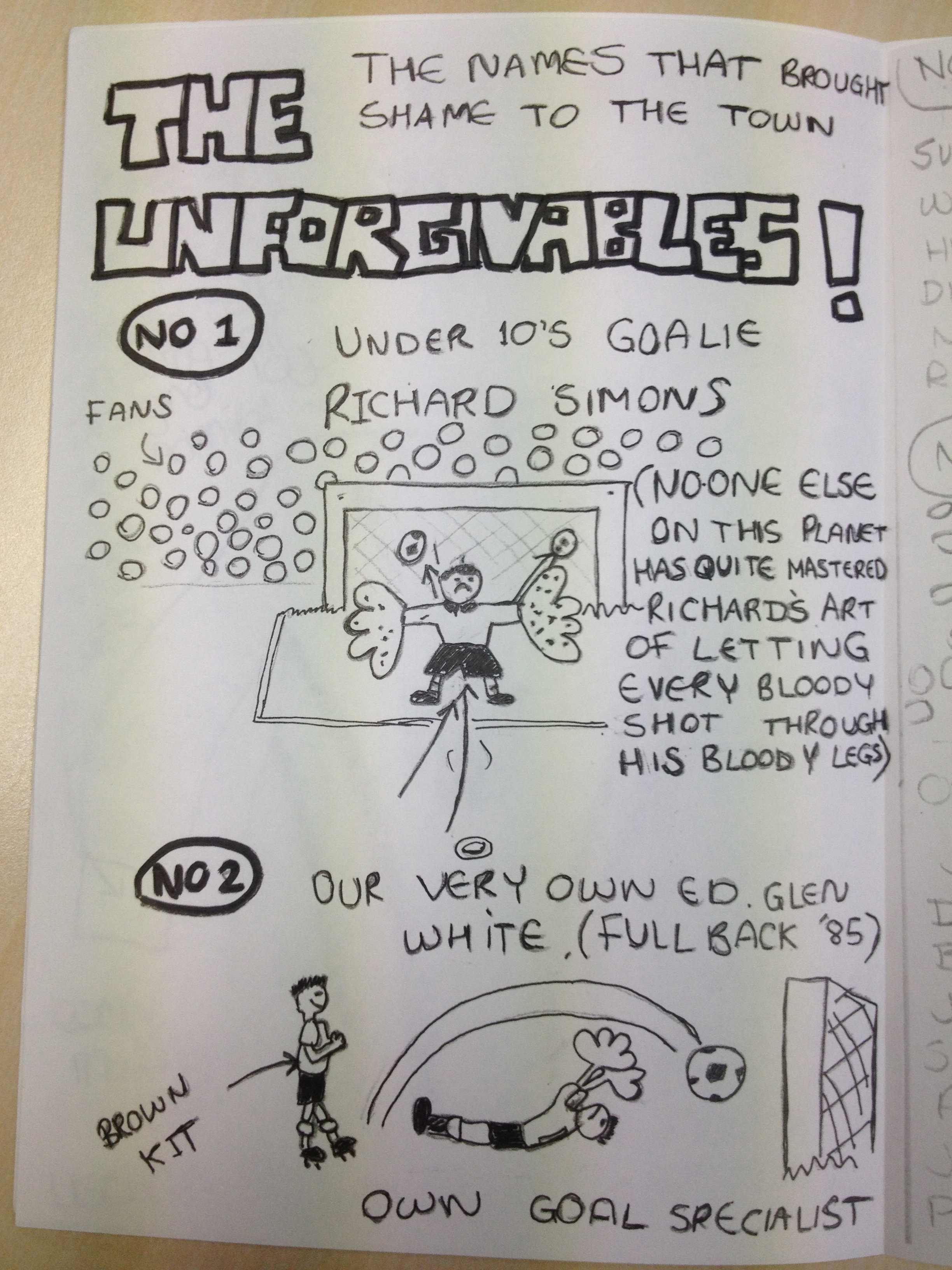 Whilst most people of our age were probably chasing after girls we were sat in my room scribbling away (definitely no computer used back then!) to cobble together some half-baked ideas to fill all the pages (8 for ASS and a whopping 12 for TMS) of this publication in one evening! We loved writing it and putting it all together though and thought it was hilarious. It’s just a shame that very few others did!!