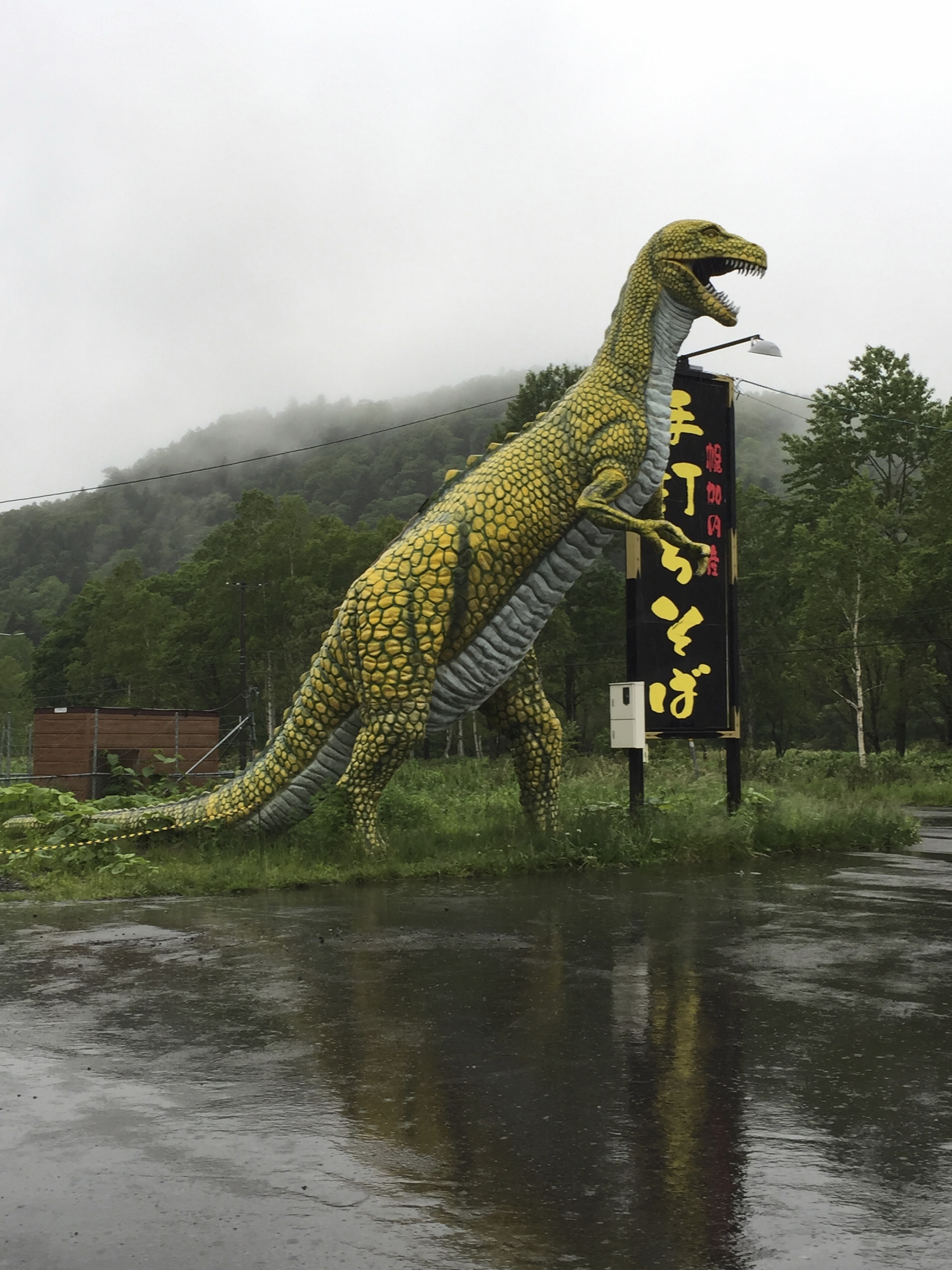 A change of clothes was most welcome back at the car and then we drove on west to Lake Toya where we stopped at a service station (with a giant dinosaur outside it for some reason) in an area famed for its mushrooms. We knew that we had a big lamb dinner ahead of us at the ryokan (traditional Japanese inn) but needed something to tie us over till then so ¥100 mushroom miso soup and some tempura mushrooms did that job.