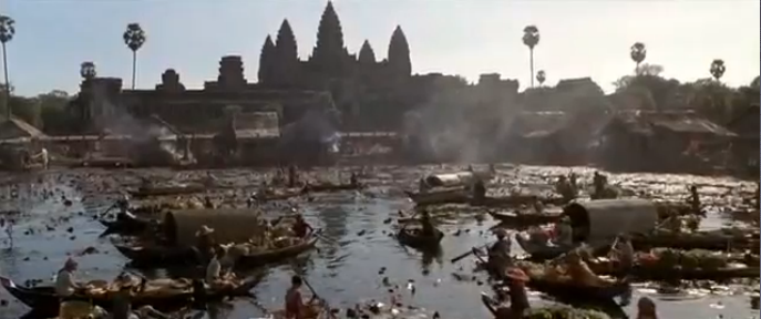 World Heritage site Angkor Wat appears on the hour mark and appears to be looming over a lake bursting with waterlilies and boating villagers. There are mixed reports on this one with some saying this elaborate floating village was constructed on the northern pond. Others refute that and say it was just a set with CGI used to add the worlds largest religious building into the background.