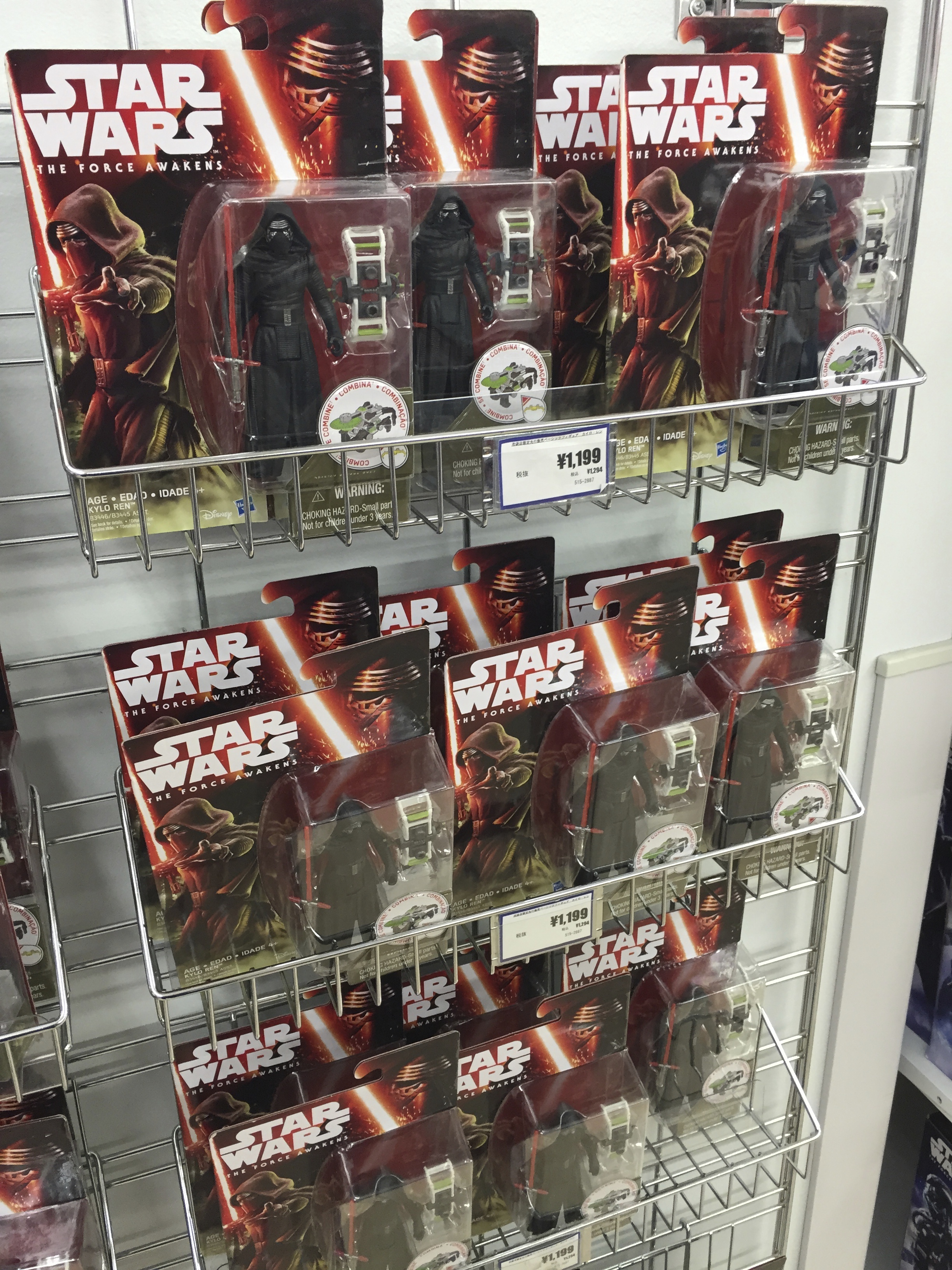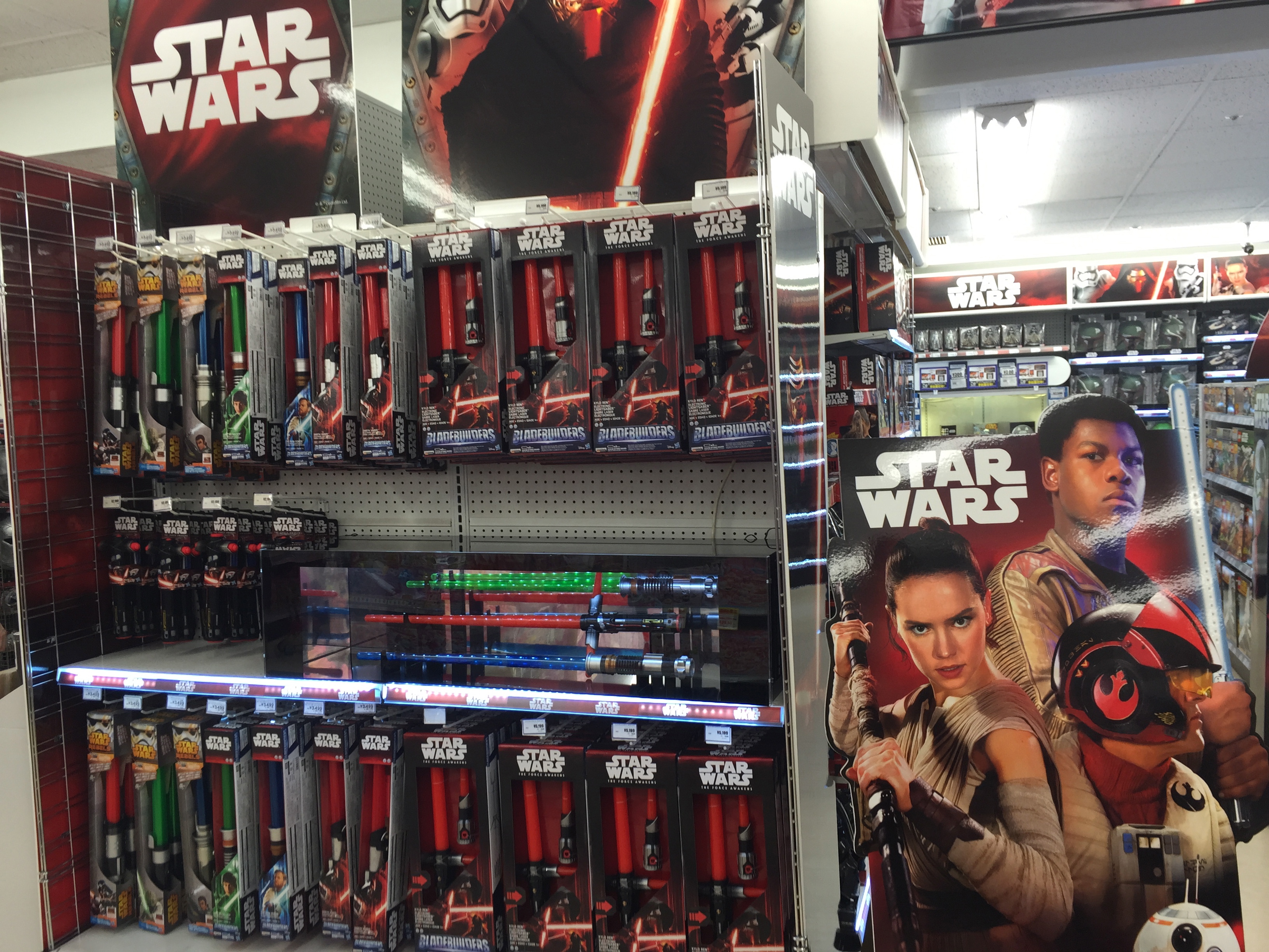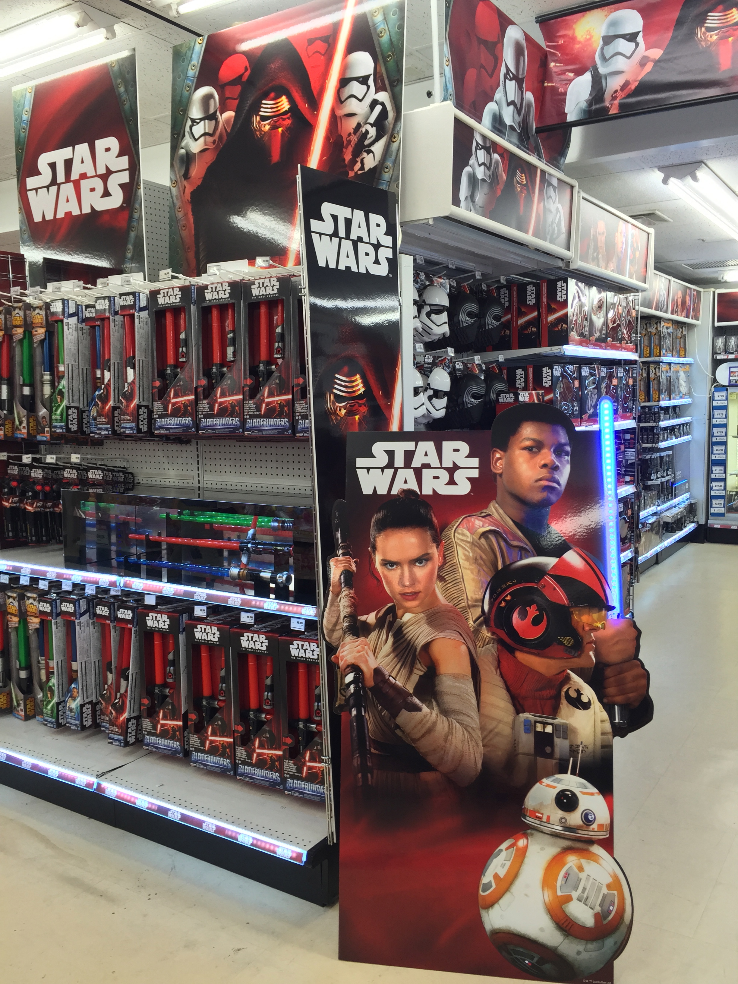 It took us a while to locate the Force Awakens goodies but just as we were pessimistically thinking there would be one or two Star Wars toys in the whole place we then saw a sizeable section devoted to all the new Star Wars things.