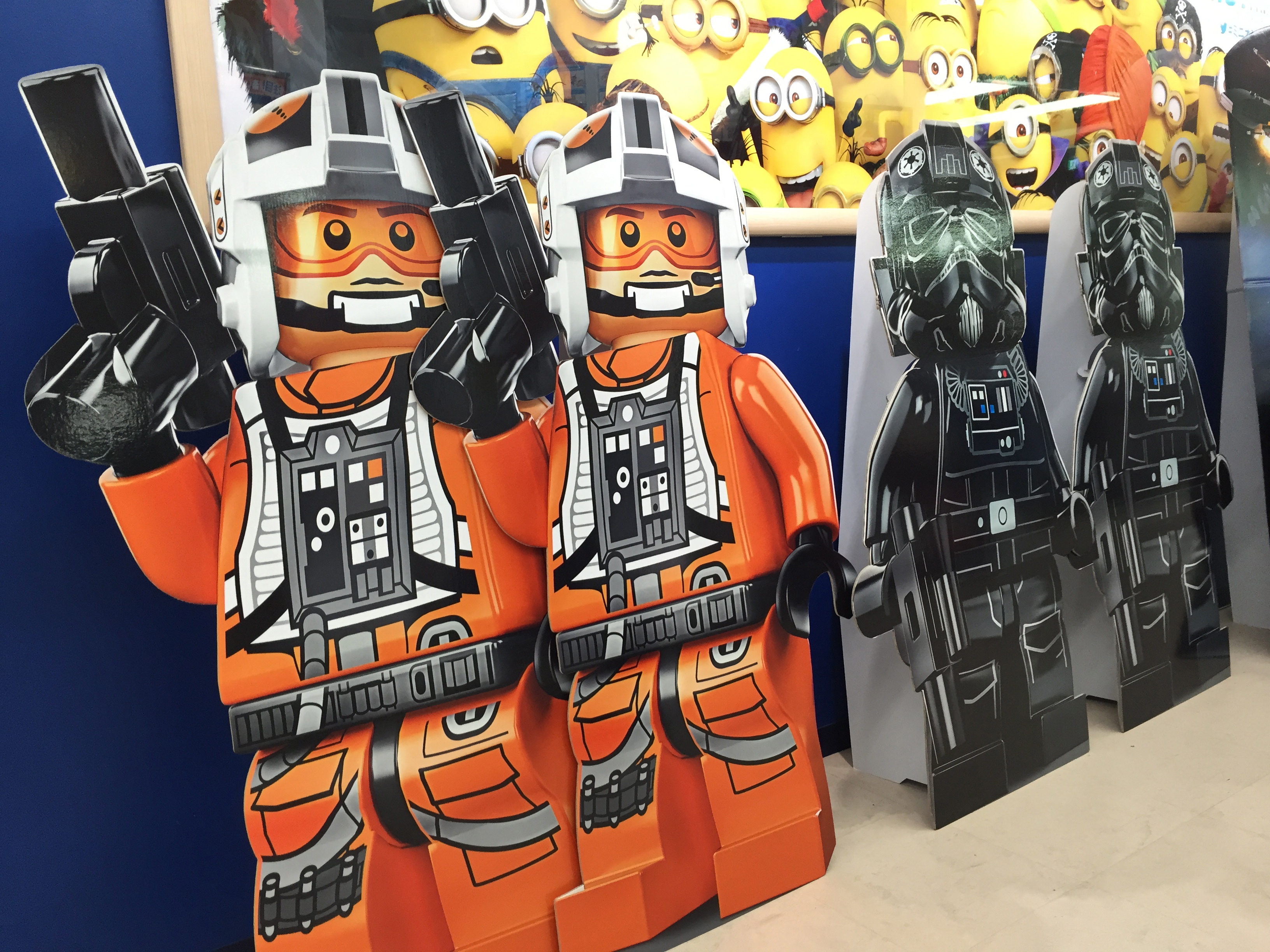 One thing that it was lacking though was figures or merchandise relating to the soccer ball droid known as BB8. Maybe that kind of thing is being held back until a bit later in the year. As we left the store one hour later (yes, we spent 60 minutes working our way through almost every single item!) we noticed some Star Wars Lego cardboard display exhibits (below) on the way out although ‘Minions‘ were doing their best to hog the limelight!