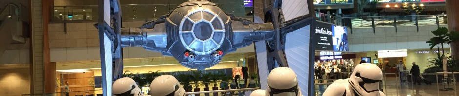 There is a Rebel Alliance X-wing fighter and an Empire TIE fighter currently exhibiting in a couple of the departure hall’s at Changi Airport which is located in the south-east corner of Singapore island. Thankfully, both are in public area’s so having landed at 6:30am last Friday morning we went upstairs to the departures area in terminal 2 where I looked for the TIE Fighter exhibit. It took me quite a while to find it but had I properly done my research, then I’d have known to just head over to check-in row 1.