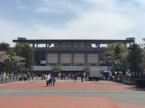 From the bus drop-off point it was a nice walk down an avenue lined with cherry blossom trees (admittedly a little past their best!) leading to a big open green park space where many fans were relaxing before the match and enjoying the 26 degrees celsius sunshine.