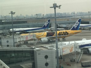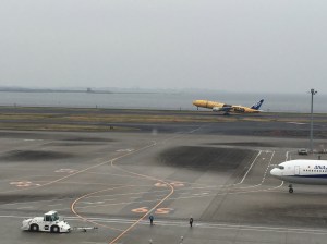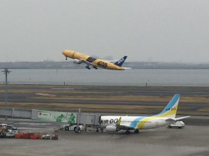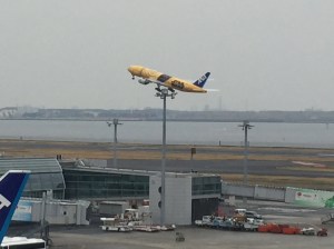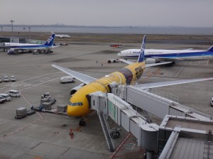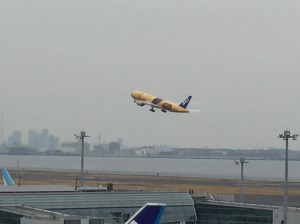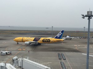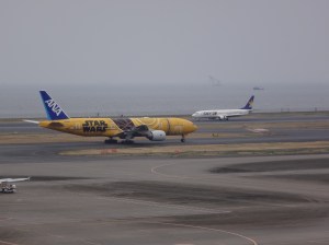 Whilst I was in the Haneda area ‘On The Fox Trail…‘ at the end of March, I thought it would be worth seeing if any of the Star Wars planes would be at Haneda Airport that day. I asked a friend who knows all that kind of stuff and by luck the new C-3PO plane, which was introduced earlier that month, was arriving at around 11am and then taking off for Sapporo an hour after that.