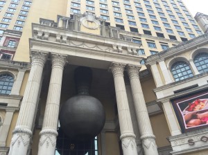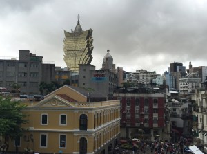 Around mid-afternoon the heavens opened up and the rain absolutely lashed it down for well over an hour as I sought refuge in the nearest covered place which was a doorway of a (closed) church. Once that had finally died down a bit I went in search of some locales from ‘Indiana Jones & The Temple Of Doom‘ (1984) (link will appear here very soon!) before returning to the Grand Lisboa Casino. The first picture below was taken from the steps of the aforementioned St. Pauls and it really does illustrate what a tacky-looking eye-sore the casino building is! It is one though that is pivotal to the economy of this Special Administrative Region (SAR) of China.