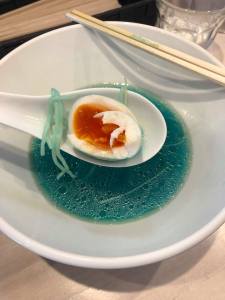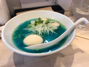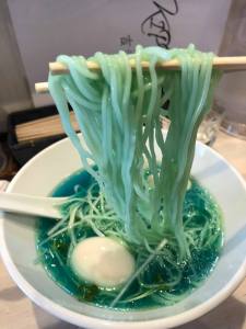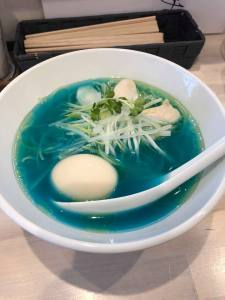The restaurant owner says the colour is all natural with no colouring or additives used. He wouldn’t reveal how it gets its colour but it is known that the broth is made via a special Chinese cooking technique which somehow results in an really clear soup. Phycocyanin, the chemical extracted from spirulina algae is rumoured to be the secret ingredient that makes this ramen blue according to one or two other sites but who really knows…apart from the ramen chefs!!