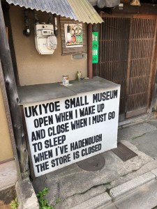 The World’s Small Ukiyo-E Museum Ichimura Ichibodo (152 Komatsucho, Higashiyama-Ku) has recently become something of a viral sensation due to the sign outside it. I guess the owner must’ve been asleep when I passed by! Yes, there are a couple of errors in the sign (below) but that’s probably not too surprising given the name of the museum is grammatically wrong!