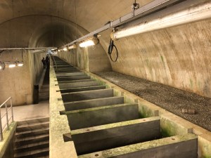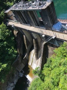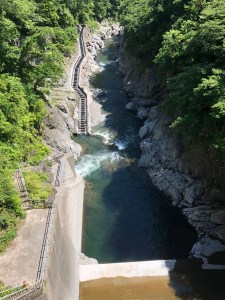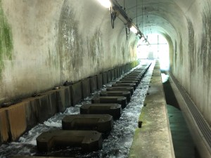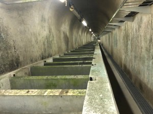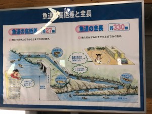Adjacent to the dam is a fairly simple looking building but it’s one that greatly hides what is hidden beneath it. A huge staircase takes visitors (free admission) spiralling down towards subterranean-like exploration and offers some respite from the heat. A long passageway then takes you under the dam and you can see how Japan’s longest fish ladder helps fish migrate upstream. It may seem a little crazy but it’s actually quite a revolutionary feat of engineering.