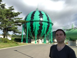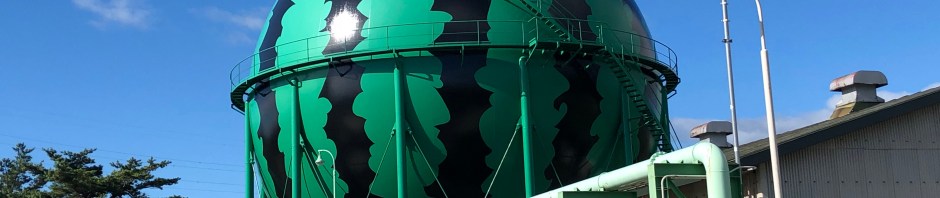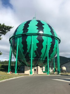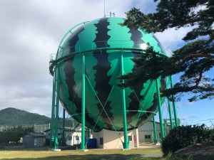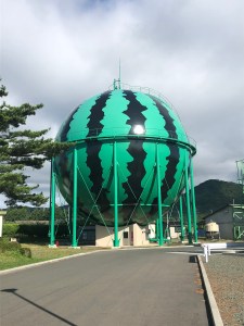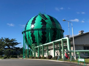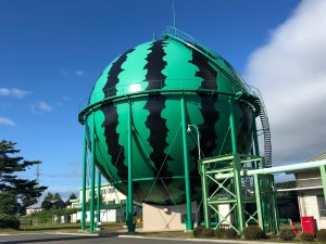 Summer watermelons are the speciality of an area in Iwate prefecture called Takizawa and that is supposedly the reason why this gas tank has been decorated to look exactly like the big fruit. However, the two things are actually 100 kilometres apart! I’ve been told that there are two other watermelon tanks like this in Japan with Kumamoto and Tomisato in Chiba playing host to them.