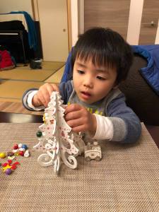 These ‘Christmas In Tokyo’ posts used to just include stuff done in the last week or two leading up to the 25th but now basically include anything that happened in the 4-5 weeks building up to the big day. It’s still all part of the festive season anyway! It got underway in late November when my nephew was around ours and started to play with my bendy Santa figure and construct this six inch tree ornament which actually is our only tree!