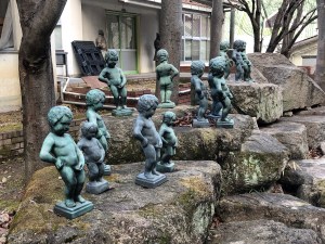 I remember being a little disappointed by the Mannekin Pis in Brussels but somehow impressed by the one that stands at the end of a platform at Hamamatsucho Station in Tokyo! Go figure! Seeing a load of them here though was quite funny, especially where four of them are gathered round in a huddle comparing their size!