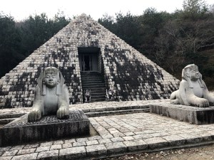 Far less impressive was the Egyptian Pyramid (below) which seemed a bit off-colour. Maybe my mind has been slightly corrupted by the bright yellow Pyramid Onsen in Tochigi prefecture! Stairs did ascend to an entry point in the middle where there is a replica of Tutankhamun gold bust and some framed pictures. With the green trees prominent in the background, this one really did seem far removed from northern Africa…not that I ever really felt I was in any of the other places represented in this park!