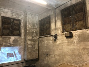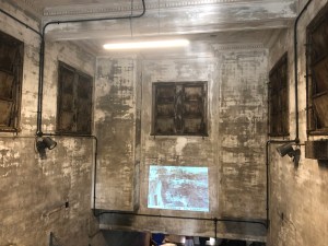 Steps lead down beneath the surface and you can see the obvious state of disrepair which comes from being closed for over two decades. There was a projection on the wall showing footage of the stations final days including things like the tickets from the last day.