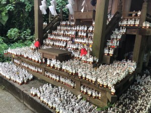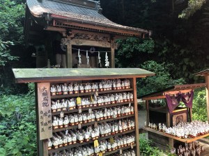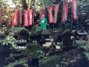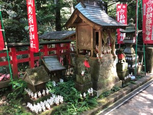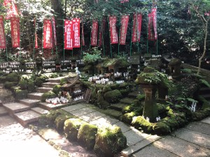 Surrounded by dense forest canopy, there was a little fenced-off area featuring the main hall with a kind of book-case structure on either side of that displaying hundreds and hundreds of white fox ornaments. With a big torii gate at the front, wooden ema plaques, flags and stone lanterns too, it was all quite the spectacle.