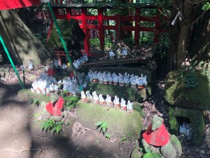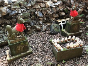 That wasn’t the end though as just a short distance further along the hiking trail were some more randomly scattered little foxes. They seemed to be placed in every nook and cranny of the rock-face and there were some tiny torii gates too.