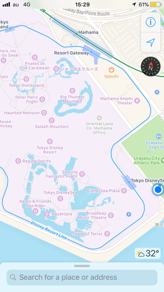 In response to the above tweet most people naturally assumed I was at Disneyland or DisneySea but if you look down to the bottom right corner of the photo below then you’ll see the blue dot was actually just outside the boundary of that magical area. It’s not the first time this has happened as earlier this year my blue dot was just over the wall from Universal Studios Japan in Osaka. It always feels a little bit strange to just be only metres away from such fun places!