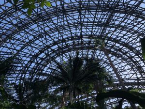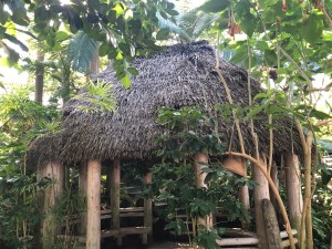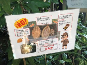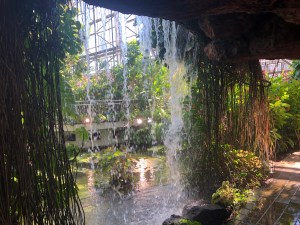 B Dome is a tropical house in a grove of palms surrounded by plants with beautiful flowers and edible fruits like bananas, mangoes, durian (preserved in a glass case) and cacao; the beans of which are used to make chocolate.