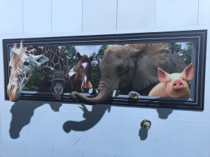 A tea lounge is part of the dome’s facilities but we didn’t consume anything there as we were going for a late lunch in Toyosu, just two stops back up the Yurakucho Line. Construction work of some sort is being done right outside the tropical plant dome and the fence surrounding the site has been jazzed up with lots of these cute, funny animal “windows”. I have since seen the same in other parts of Tokyo so it’s certainly not unique to Yumenoshima.