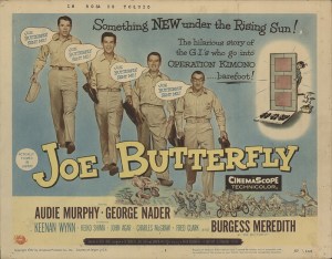 ‘Joe Butterfly‘ is a service comedy from an unproduced play that hasn’t aged well at all due to a white actor playing a major Asian role which was fairly common back then but certainly wouldn’t pass in the current climate. Marlon Brando in ‘Teahouse..’, Ricardo Montalban in ‘Sayonara‘ (1957) and Mickey Rooney in ‘Breakfast At Tiffany’s’ (1961) all did it and here it’s Burgess Meredith who plays the title role.