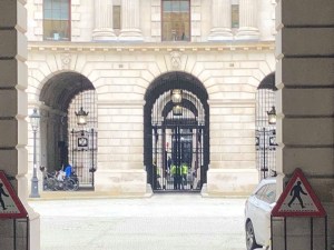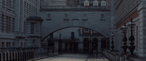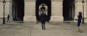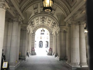 As is so often the case Bond is summoned to London for a word with M (Ralph Fiennes) and Moneypenny (Naomie Harris) chases after him on 18 minutes in the Foreign & Commonwealth Office Courtyard (below) on King Charles Street in Westminster. The circular courtyard of the government office is that of the Treasury Building on Great George Street, off Whitehall.