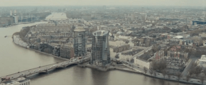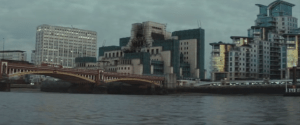 After being blown up in ‘Skyfall‘ (2012), the MI6 HQ at Vauxhall Cross (below) is still derelict as Bond and Tanner (Rory Kinnear), the MI6 Chief of Staff, cruise past it on their boat journey up the River Thames to MI6’s new basement bunker on 22 minutes.