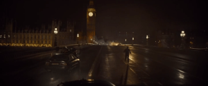 Blofeld’s helicopter is shot down by Bond and crashes onto Westminster Bridge on 131 minutes. Blofeld manages to crawl away from the wreckage but is confronted by Bond who leaves him to be arrested by M rather than kill him.
