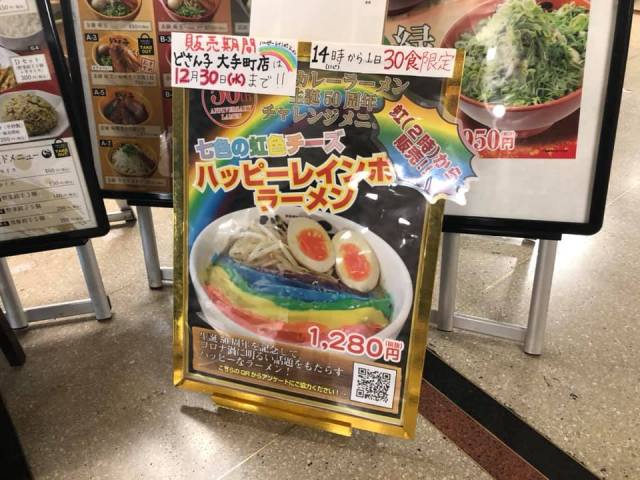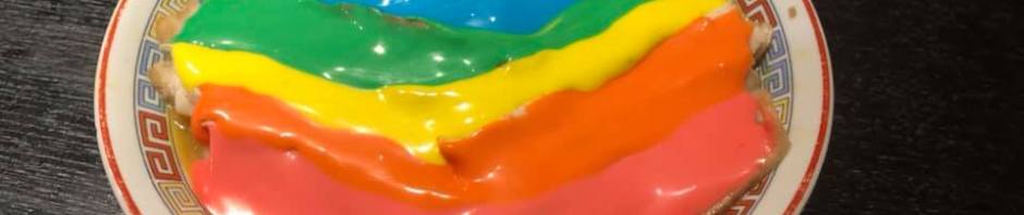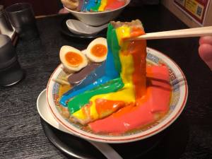 The seven colours of the rainbow are made with coloured cheese fondue sauce and then carefully placed on individual slices of the chashu (braised pork belly) meat in order to keep it all in place and let the Instagram generation (plus bloggers!) get their photos!
