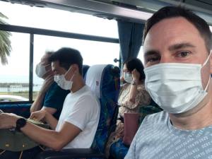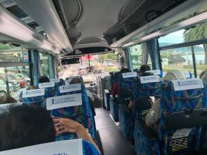 Hand sanitiser was on hand to be applied a couple of times and after boarding the bus it left exactly on time at 1:15 pm. We had had to reserve our seats online beforehand which was simple enough and didn’t cost anything. As the Izu Velodrome is in the middle of nowhere in the mountains, it actually takes about 30 minutes for the bus to wind its way up the road along the same route which I had rather foolishly cycled up a couple of years ago. It’s a rather steep climb so pushing my bike was what I mostly did! I had expected a library-type atmosphere on the bus but we weren’t the only ones chatting away excitedly in anticipation of what was ahead.
