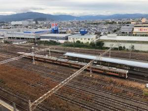 After about five hours sleep I woke up and felt obliged to try out the hotel’s hot spring bath on the top floor so I was in there by myself just after 6am. I wasn’t first that morning though as someone was coming out as I entered the changing room. This was the view (below) from the changing room window overlooking the station fringed by mountains in the background.