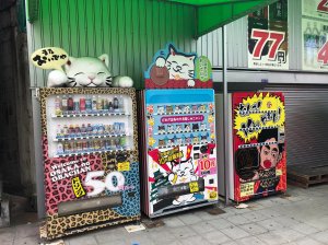 There seems to be something of a cat theme going on as some of the machines have manneki neko (beckoning cats) decorations on top of them, and one of them had cats in place of the items you usually push the buttons for. This particular mystery machine was selling all goods for just 10 yen a pop but every single one of them had sold out!
