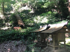 We turned right at the red gate behind the torii and were greeted by the sight of a wonderful mossy green carpet and a beautiful, charming and unique wooden hall surrounded by a variety of different, tall oak trees. The area all had a feeling of being relatively untouched (or certainly unaffected) by humans.