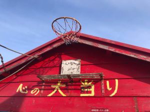 Another interesting quirk of this fish shrine is the basketball hoop attached to the wooden shed just beyond the trio of gates. The handwritten yellow-painted words reads kokoro no ooatari which translates as something like big hit in the heart!