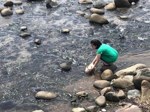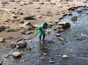 Our dog still isn’t too familiar (or comfortable!) with such terrain especially the movement of the waves washing up on the shore! The clear, shallow waters are fine for both humans and dogs (?) to swim or wade in but this beach seems more popular with surfers for the most part of the year. The waves do seem to be quite small though. The estuary (?) running into the sea proved to be a better option for cooling the dog off.