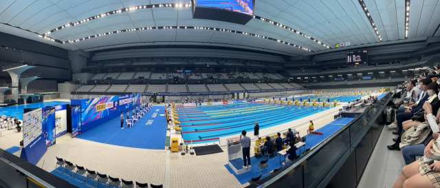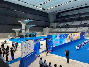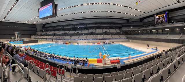 This Aquatic Center was completed in February 2020 and consists of a swimming pool, diving pool, sub pool, practice area and 15,000 seats. There were a couple of hundred people there at best for this event yet the seats either side of me and around me were all taken meaning I couldn’t spread out.
