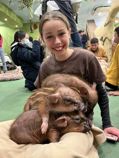 As soon as we sat down on our cushions in the open plan area, the piglets swarmed round us and my youngest niece Sioned soon had three or four pigs in her lap. It was lovely to see her enjoying the moment but you do feel a little left out if they ignore you for a while, especially when the time is quite limited.
