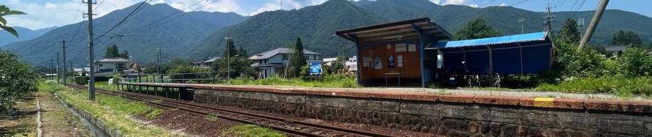 This most simple of stations originally opened in September 1922, and has one ground-level side platform serving a solitary bi-directional track. New signage replaced the old ones a few years ago to commemorate the 100th anniversary of the foundation of Alpico Kōtsū; the private railway company that operates the Kamikōchi Line.
