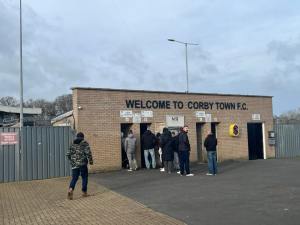 Around lunchtime, Karl picked me up at Market Harborough railway station and drove us to Steel Park, the home stadium of Corby Town. We were there within ten minutes of leaving and the beauty of such lower league football is being able to park for free right outside the stadium.
