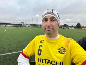 Harborough Town play in yellow but as I don’t have one of their shirts I thought I’d wear the top of my Japanese club who wear the same colour. I very much doubt a Kashiwa Reysol jersey has ever been worn in this part of the world! Given the Arctic-like conditions, it was almost instantly covered up once I’d taken my photo!